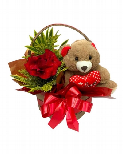 Cesta Fofura Rosas e Urso de Pelúcia, uma surpresa carinhosa com muito amor a apresentar.